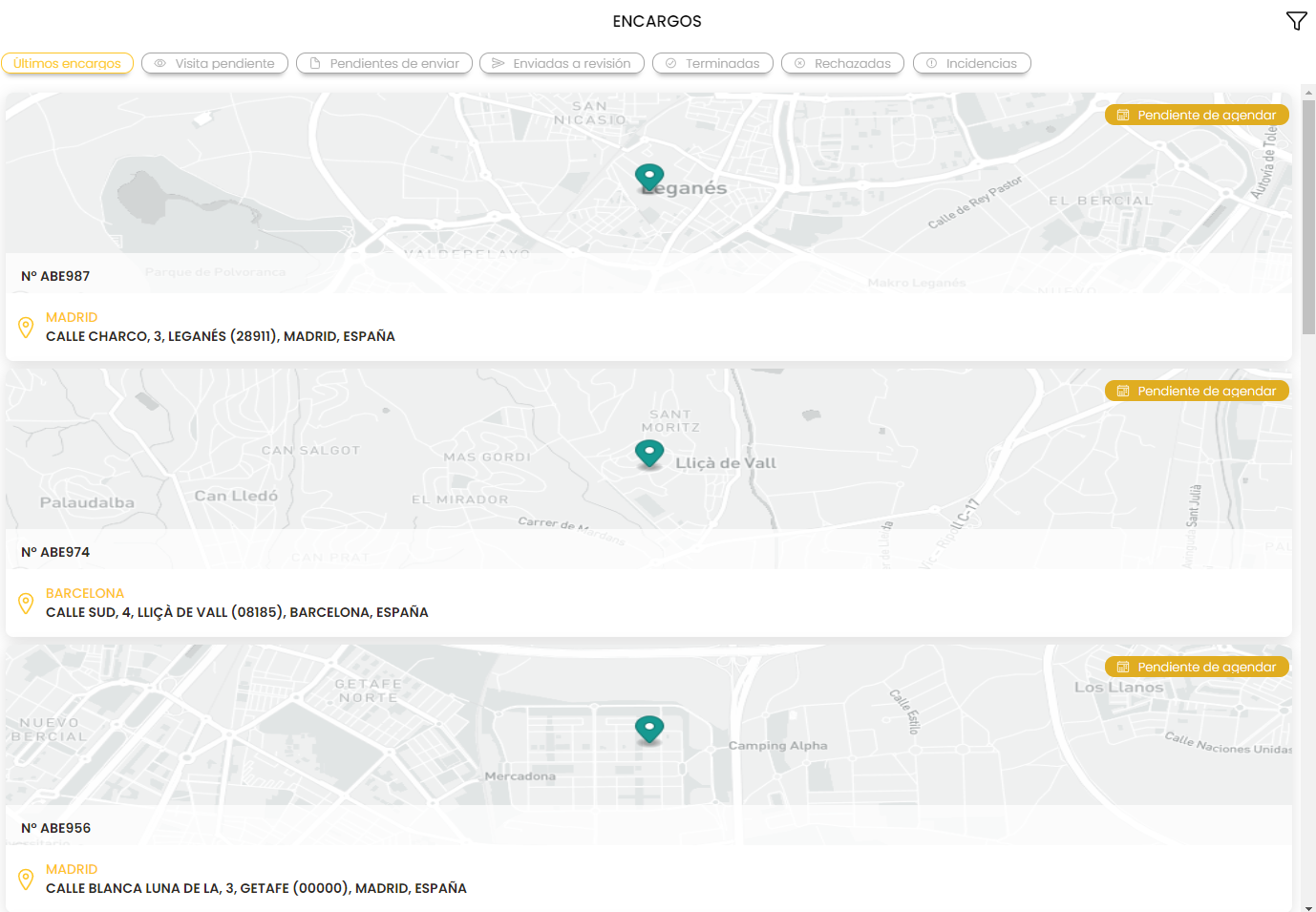 A lo largo de toda la parte superior se muestra una clasificación rápida de los encargos según el estado en el que se encuentren.